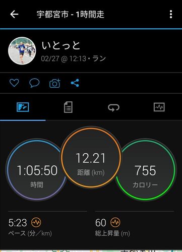 2/27~3/5に走った分のまとめ。 2/27(月) お昼に走ってきました。 平均ストライド(m) 平均ピッチ(歩/分) 0.98[m] 189[歩/分] 合計:12.2km/01:05:50(5分23秒/km)午前中は休みだったのでのんびり走ってきました。 2/28(火) お昼休みに走ってきました。 平均ス…