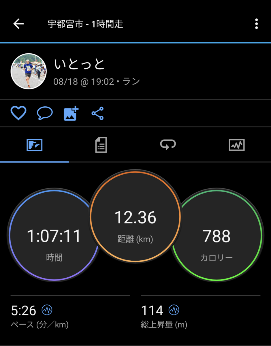 自宅を出たときにちょっと蒸し暑いかなと思っていたのですが、周回するところはもっと暑くてアスファルトがまだ放熱している感じでした。ペースはちょっと上げてみましたがこれが限界でした。