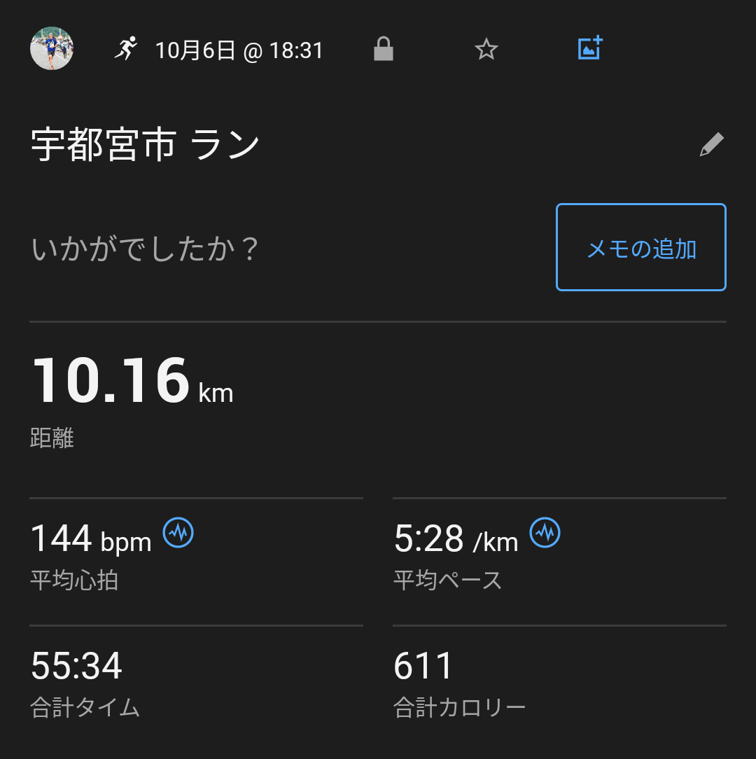 今日は3連休に入る前日なので軽く5kmくらいジョグをして終わろうと思っていたのですが暑すぎず寒すぎずのちょうどいい感じだったので結局10km走っちゃいました。