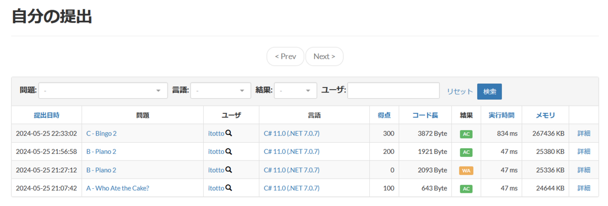 終わってから他の問題も見てみたのですがわりと解けそうな問題がいくつかあって(本で読んだ累積和を使う問題とか出てた)、ケーキを食べずにちゃんと解けばよかったなと少し反省しました。